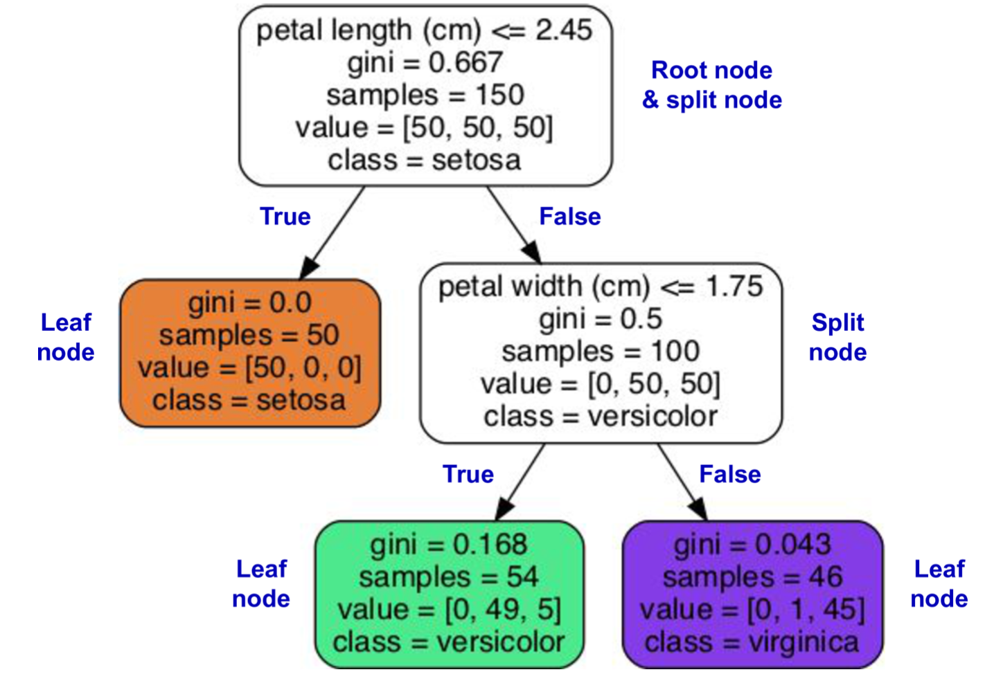 Iris Dataset Example: A decision tree trained on the iris dataset using petal length and width as features.