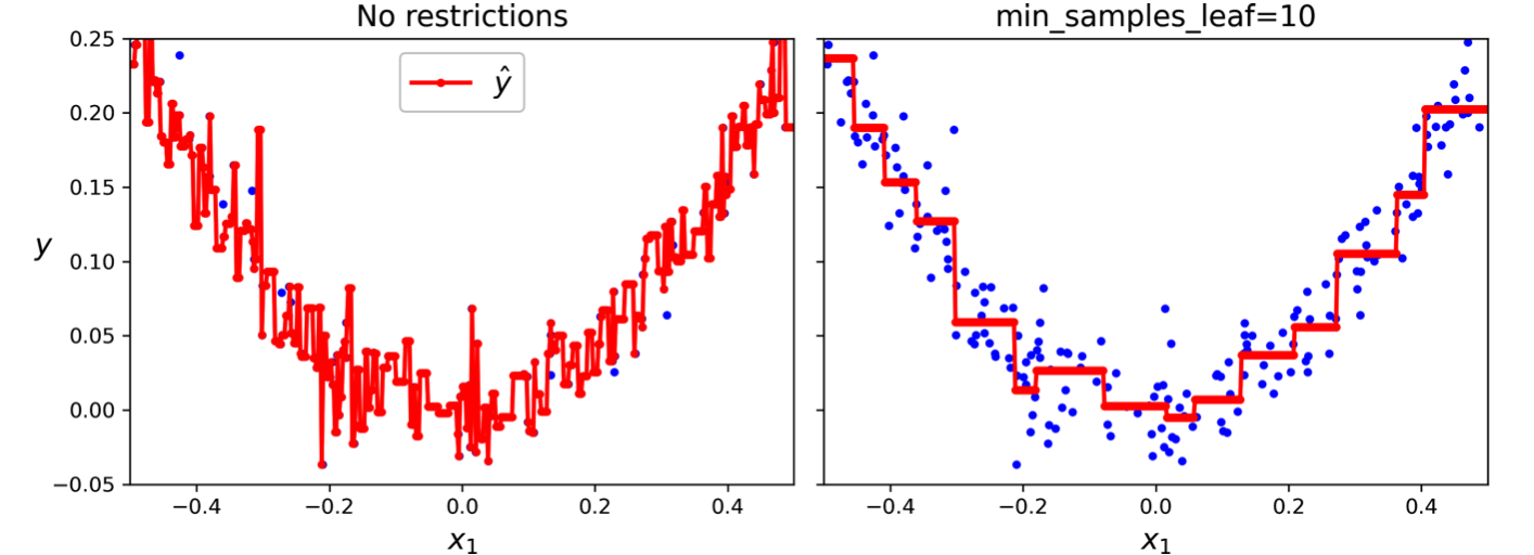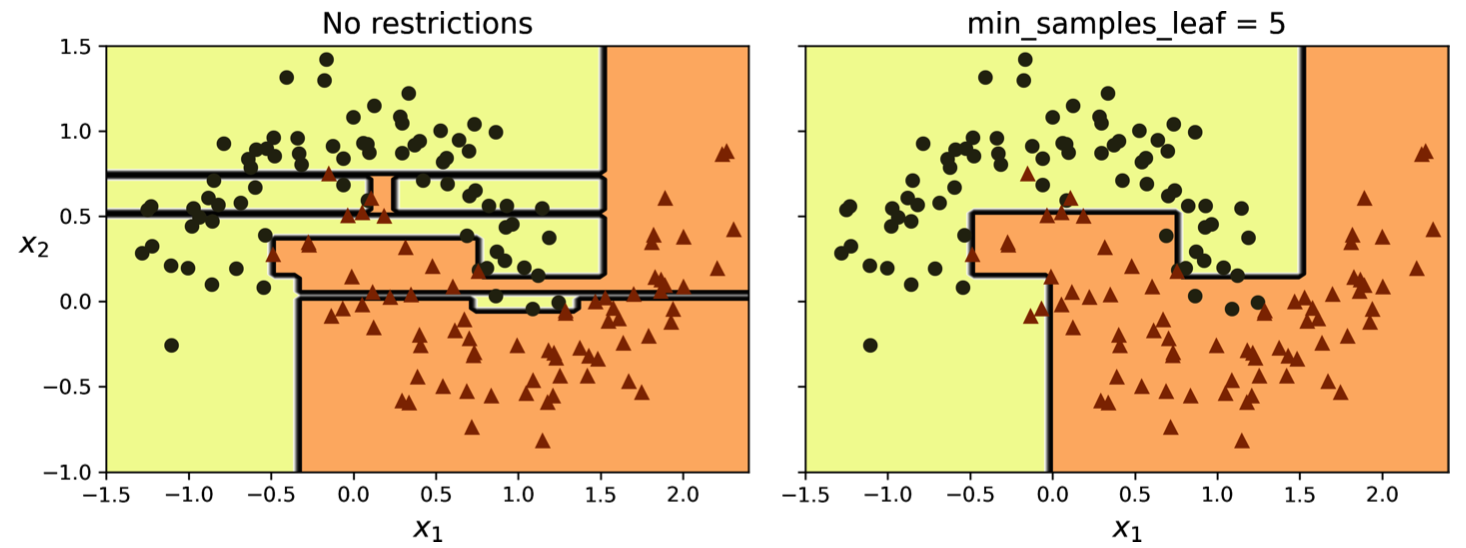 max_features: Limits the number of features considered at each split. By evaluating a subset of features, the algorithm introduces randomness and reduces the tree's sensitivity to individual features, promoting generalization.max_leaf_nodes: Caps the number of leaf nodes in the tree. This constraint directly limits the tree's complexity and encourages the algorithm to focus on the most informative splits.min_samples_split: Sets the minimum number of samples required to split a node. Increasing this value prevents the algorithm from splitting nodes with too few samples, which could lead to overfitting.min_samples_leaf: Specifies the minimum number of samples a leaf node must have. This hyperparameter prevents the creation of leaf nodes with very few samples, again addressing the issue of overfitting.min_weight_fraction_leaf: Similar tomin_samples_leafbut expressed as a fraction of the total weighted instances. This option is particularly useful when dealing with weighted instances, allowing for more nuanced control over leaf node creation.