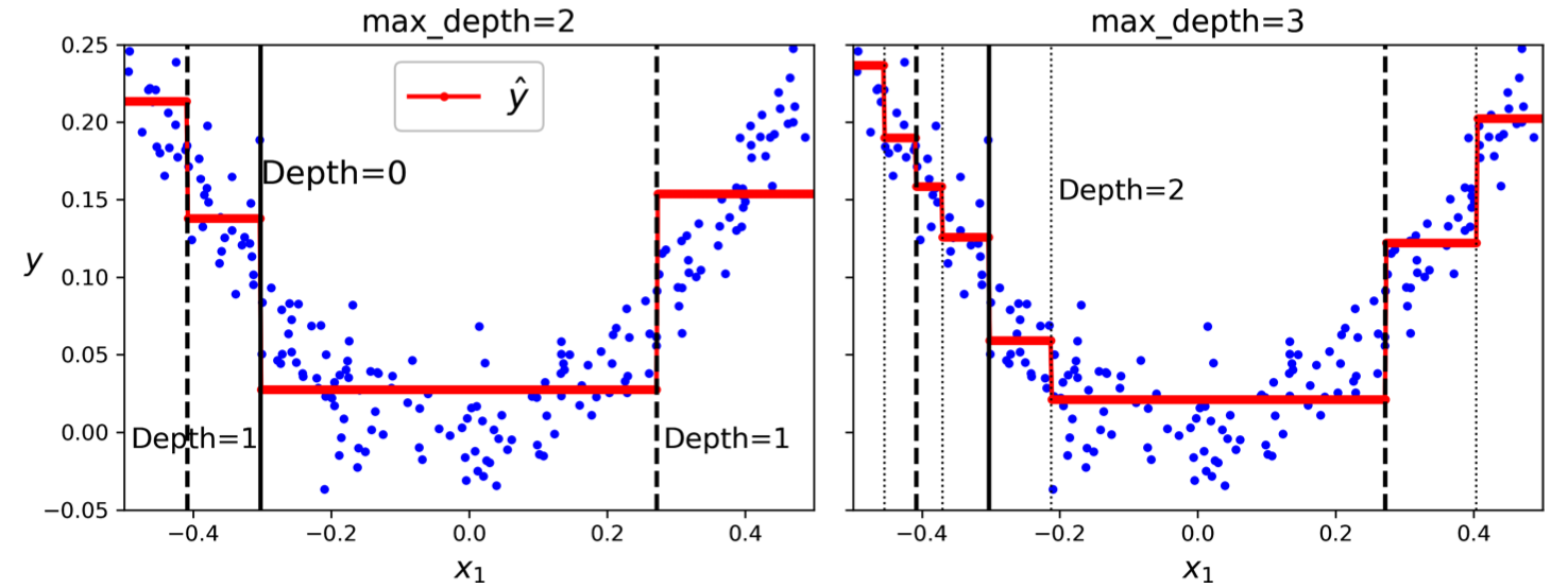 This process of splitting continues recursively, dividing the training set into increasingly homogeneous subsets. The recursion stops when specific criteria are met, such as reaching the maximum depth specified by the max_depth hyperparameter or encountering a node with fewer samples than min_samples_split.