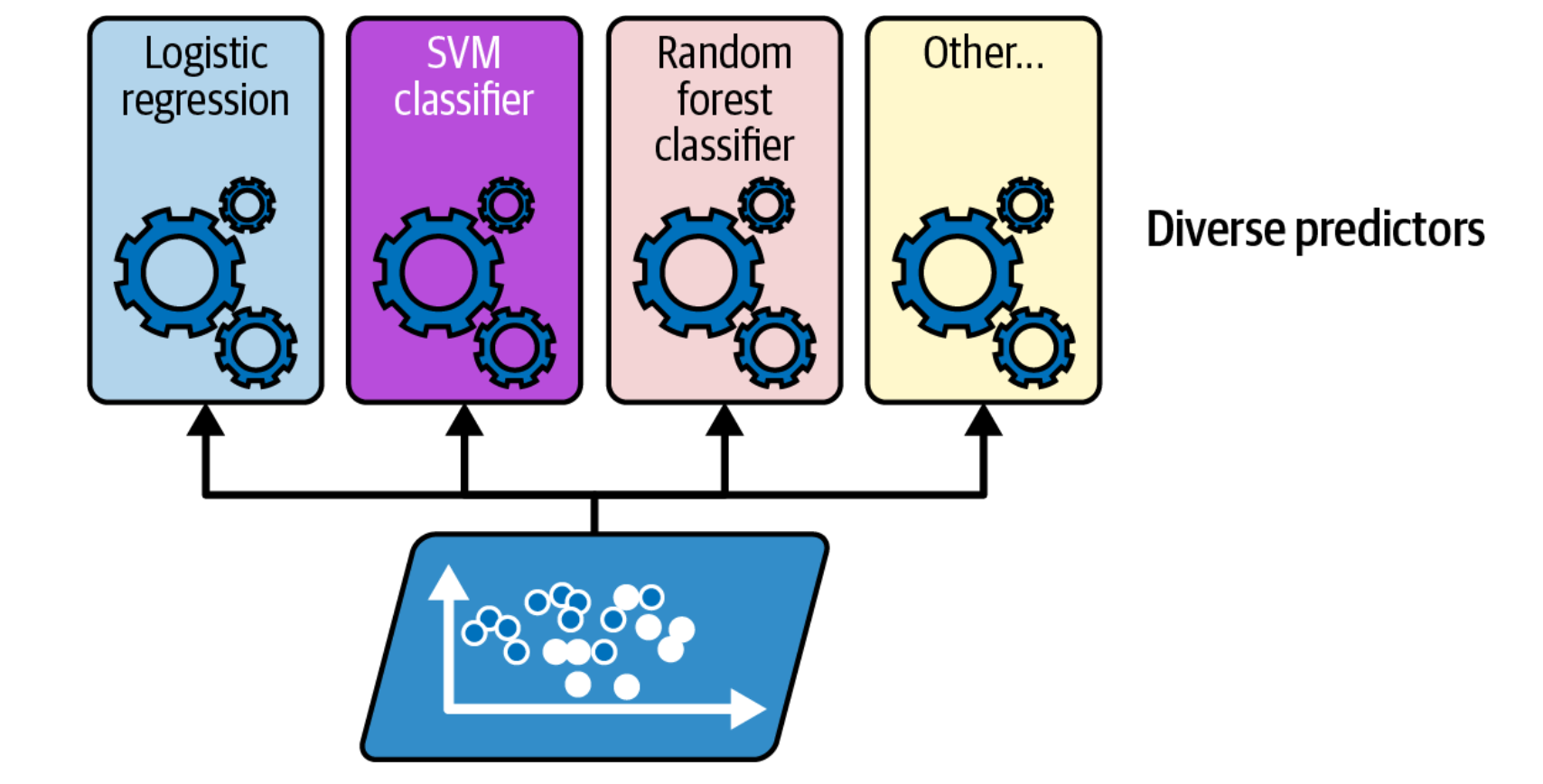 Ensemble learning is a machine learning technique that combines multiple individual models, often referred to as base models, to produce a more powerful and accurate predictive model.[*](Primary reference: Hands-On Machine Learning with Scikit-Learn, Keras, and TensorFlow by Aurélien Géron (3rd edition, 2022).) This strategy, inspired by the "wisdom of the crowd", leverages the principle that aggregating predictions from a group of models often yields better results than using the best individual model.