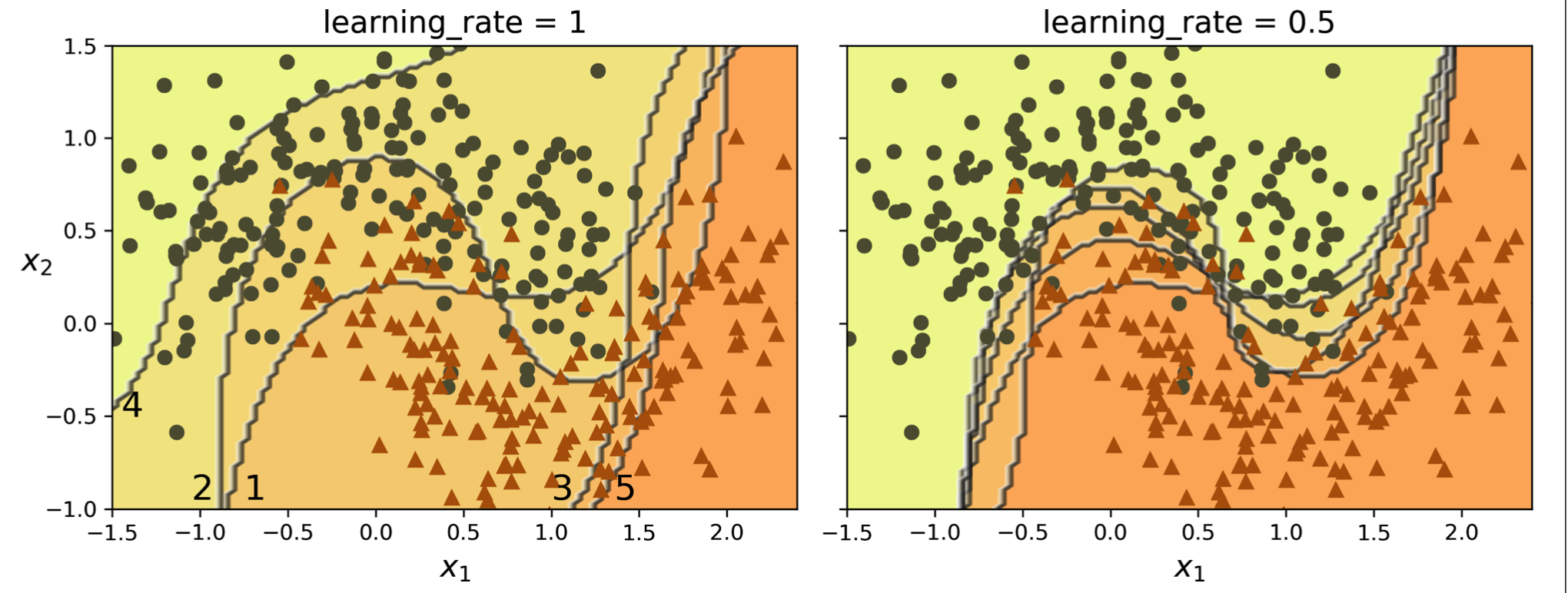 AdaBoost Decision Boundaries: How consecutive learners progressively focus on harder instances, improving the ensemble's accuracy.