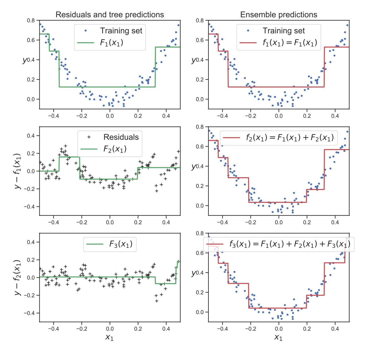 Gradient Tree Boosting: Visualization showing how each tree fits the residual errors of the previous ensemble, progressively improving predictions.
