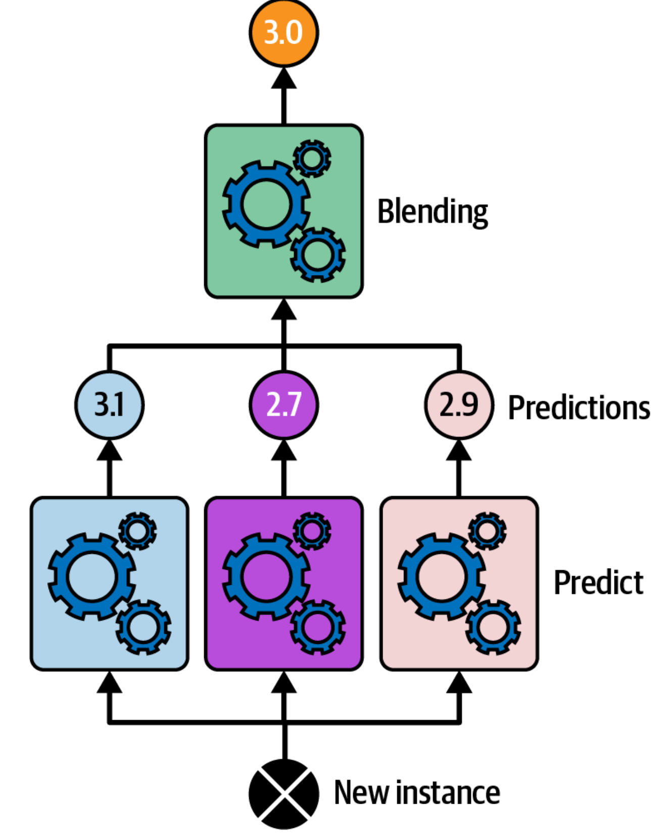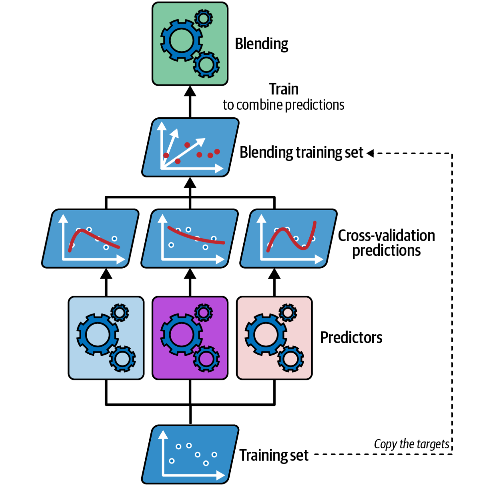 Stacking, also known as stacked generalization, is an advanced ensemble learning technique designed to enhance the predictive performance by training a meta-learner to combine predictions from multiple base models.[*](Original stacking paper: Stacked Generalization by Wolpert (1992).) Instead of using simple averaging or voting, stacking leverages a final model, referred to as a blender or a meta-learner, to learn the optimal way to aggregate the base model predictions. This process captures potentially complex relationships between the base model outputs and the target variable, leading to a more accurate final prediction.