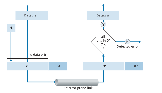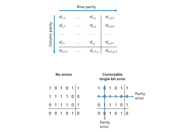 Error detection and correction techniques in the link layer involve augmenting data with error-detection and -correction bits (EDC) at the sending node. The data, along with EDC, is sent to the receiving node in a link-level frame. The receiving node then receives a sequence of bits, D' and EDC', which may differ from the original D and EDC due to in-transit bit flips.