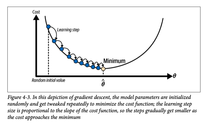 - Update the parameters: Adjust the parameters (θ) by taking a small step in the direction opposite to the gradient. The size of this step is determined by the learning rate (η).