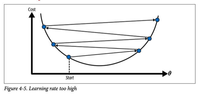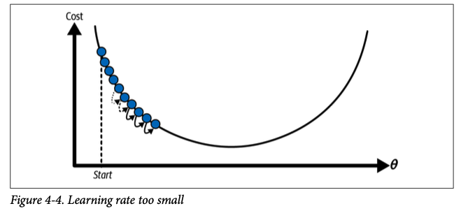 Learning Rate An important parameter in gradient descent is the size of the steps, determined by the learning rate hyperparameter. If the learning rate is too small, then the algorithm will have to go through many iterations to converge, which will take a long time