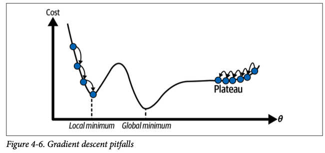 Not all cost functions are simple: Instead of resembling a smooth bowl, some cost functions can have irregular landscapes with holes, ridges, and plateaus. This irregularity can lead to challenges in converging to the global minimum.