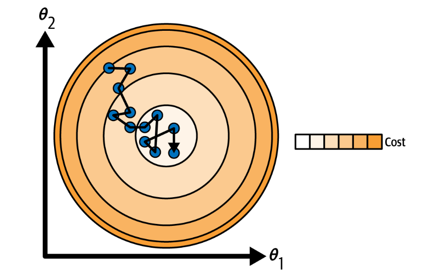 In contrast to batch gradient descent, SGD randomly selects a single instance from the training set in each iteration and computes the gradient based on that single instance. While this makes SGD much faster, especially for large datasets, the updates to the parameter values become noisy and the path toward the minimum less stable. Despite not converging as smoothly as batch gradient descent, SGD might be better at escaping local minima due to its stochastic nature.