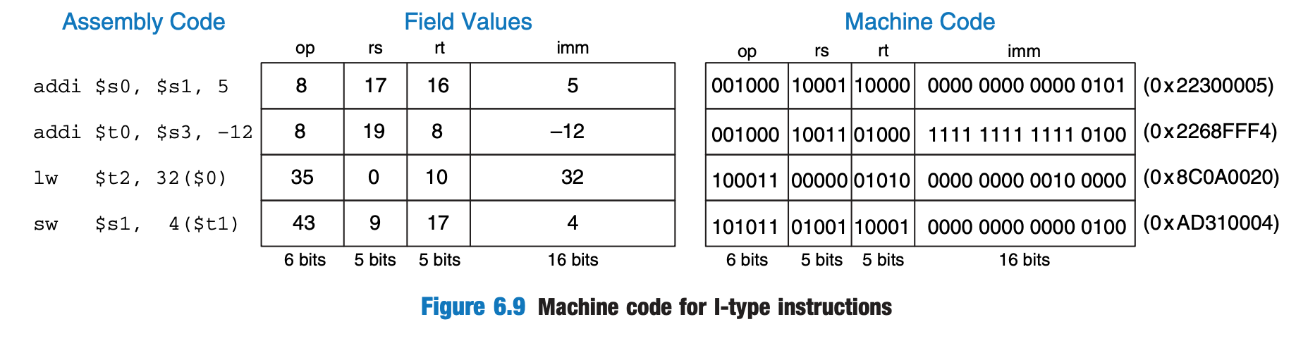 - Opcode: Determines the operation (e.g., add immediate, load word).