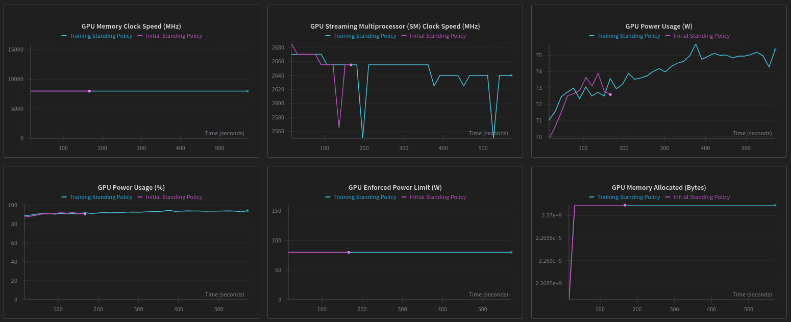 We can clearly see the difference between a successful run (Blue) and a failed/early run (Pink) in the metrics: