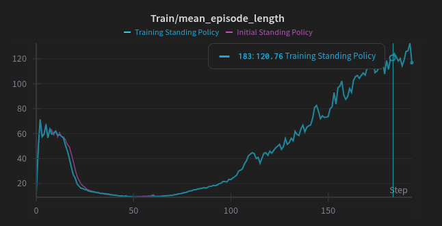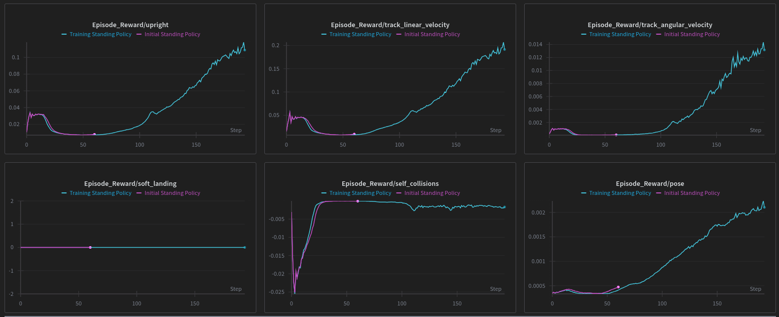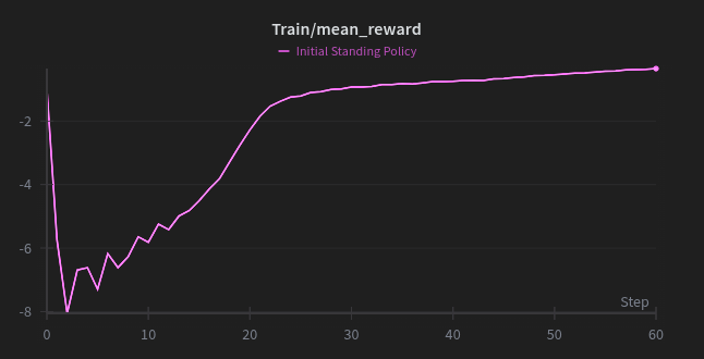Analysis: You can see the distinct "knee" in the curve where the policy discovers the stable region. The reward signal transitions from minimizing falling penalties to maximizing posture rewards.