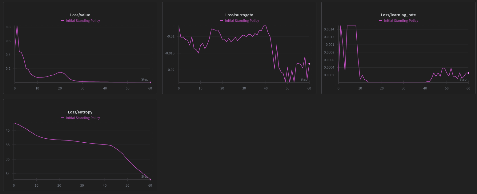 This state is fascinating. The robot has learned that "falling is bad," but it hasn't mastered the fine-grained motor control. We can actually see this failure mode in the telemetry of the Initial Standing Policy: