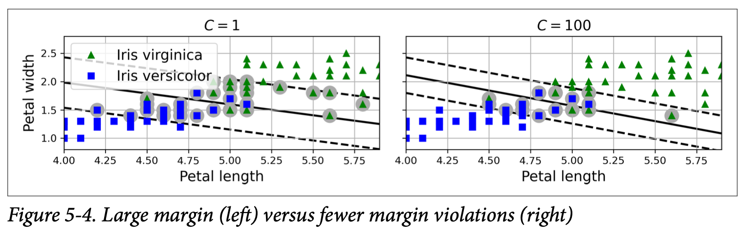 Soft Margin Classification: Allows margin violations controlled by the regularization parameter C. Lower C values create wider margins but more violations, while higher C values create narrower margins with fewer violations.