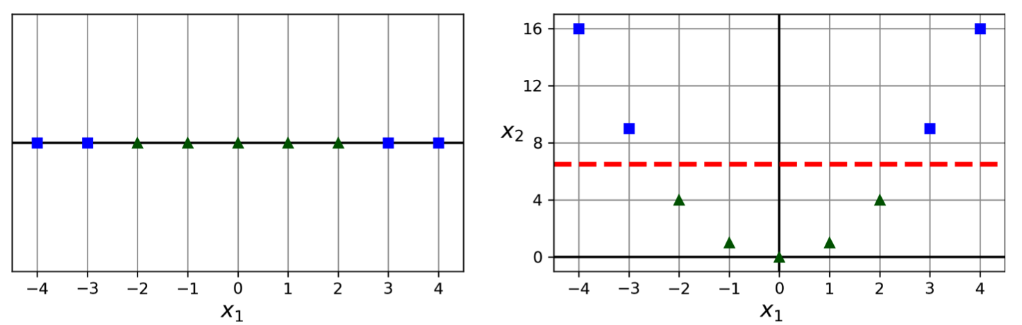 Illustrative Example: Incorporating a squared feature () can transform a non-linearly separable 1D dataset into a linearly separable 2D dataset.