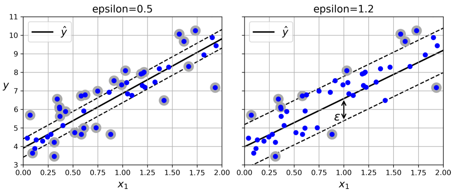 This margin of error is determined by the hyperparameter epsilon (). The figure below illustrates how different epsilon values influence the width of the margin and the number of support vectors.