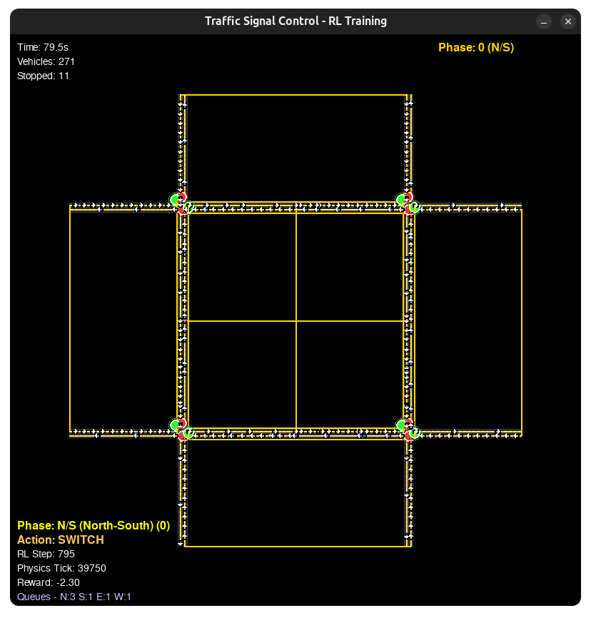This math is critical for the RL agent. Because the IDM includes a braking term, vehicles have "inertia." If the agent switches the light to Red too late, the queue length doesn't just increase linearly; a deceleration shockwave propagates backward. The agent has to learn that clearing a queue takes time due to startup transients (), penalizing it for letting lines get too long.